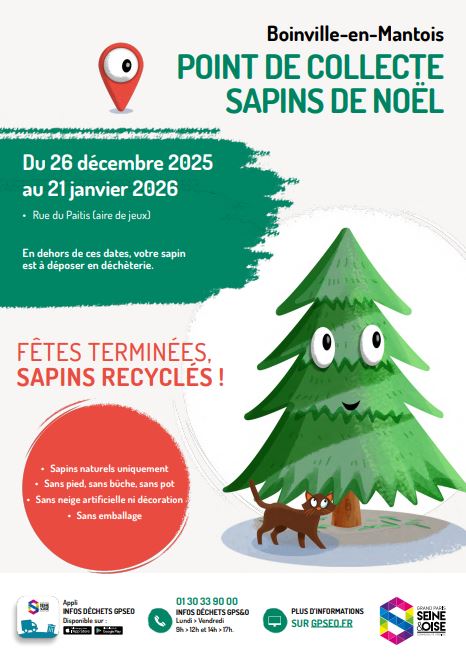 La collecte des sapins aura lieu sur notre commune du 26 décembre 2025 au 21 janvier 2026 en point d’apport volontaire rue du Paitis (au niveau de l’aire de jeux).