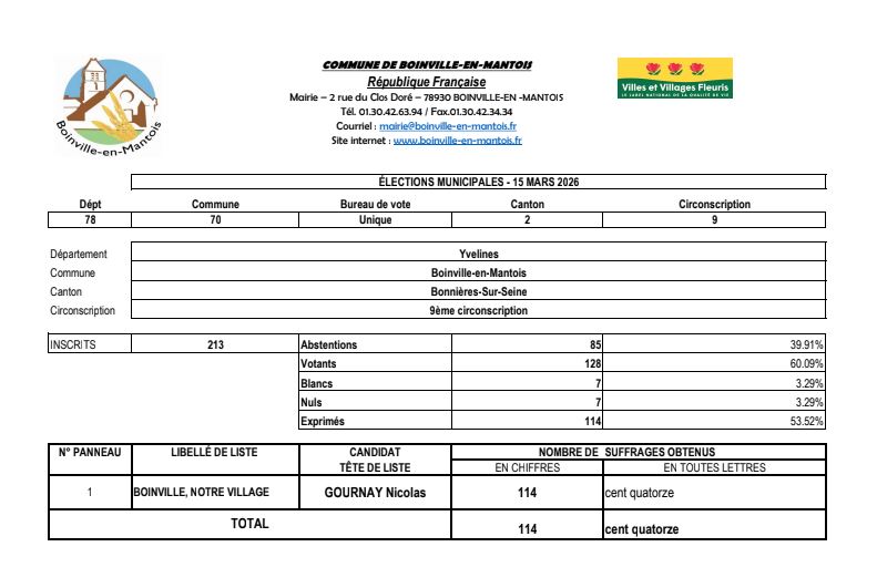 Nous vous informons des résultats complets de l’élection municipale du 15 Mars 2026 :
